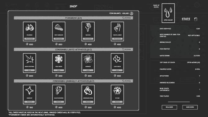 Stranded in the aftermath of a passenger jet crash, you are the sole survivor in a merciless winter wilderness. Your mission: stay alive long enough to make it back to civilization — all while navigating this deadly environment in a unique card-based survival experience. Journey through over 10 diverse environments, from the wreckage of the crash site to frigid rivers, abandoned towns, and vast, unrelenting winter terrain that will test every ounce of your survival instinct. Hunt, fish, trap, and scavenge to find vital food and supplies — anything you can use to stay alive. Craft campfires and wear the right gear to shield yourself from the biting cold. Manage your Hunger, Thirst, Sanity, and Cold, constantly balancing your resources and energy to stay alive. Every decision you make can be the difference between survival and death. When you die, your save file is wiped — no second chances. But death isn’t the end. Each run earns you coins, which you can spend in the shop after death to unlock meta-progression cards and shape your next attempt.